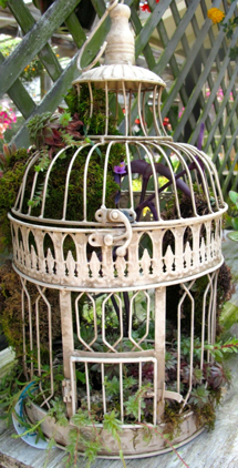 A birdcage chock-full of plants at Sarah’s Garden Center in Brockport, NY.