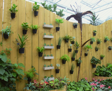 At Floriade 2012, pots mounted on a fence display a variety of foliage plants.